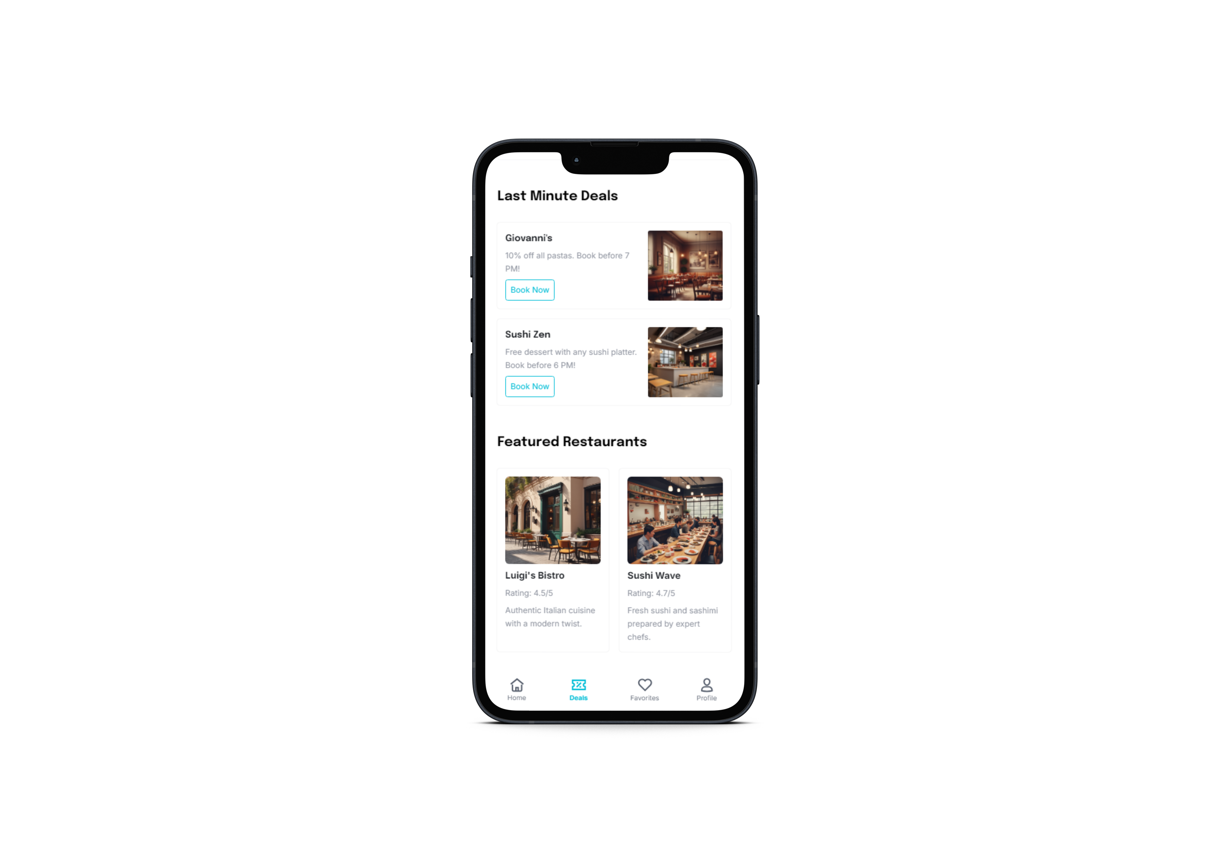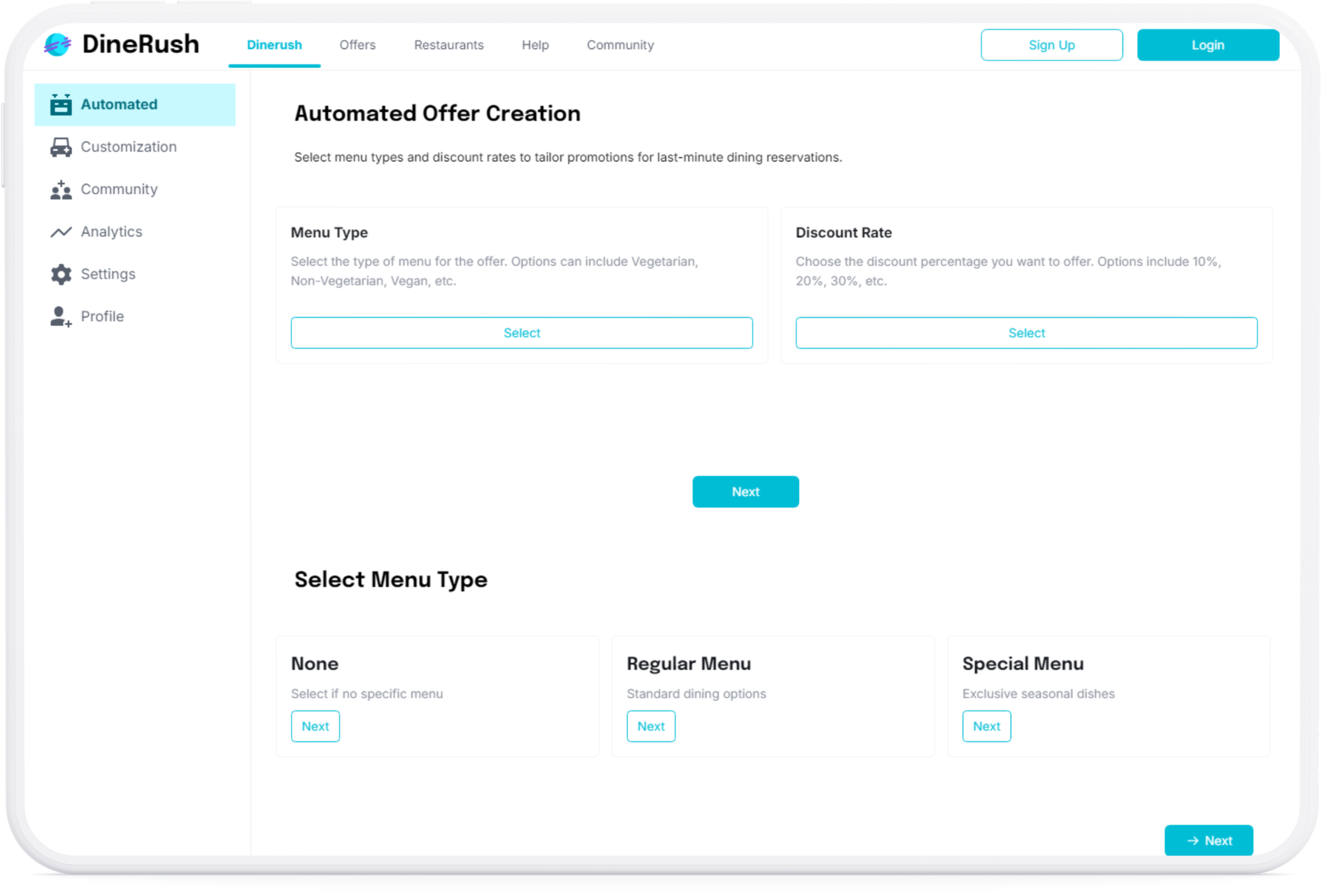 თქვენი ცარიელი მაგიდები ჩვენი ავტომატური შეთავაზებების შექმნის სისტემით — უბრალოდ აირჩიეთ მენიუ და ფასდაკლება, DineRush კი დანარჩენს თავად